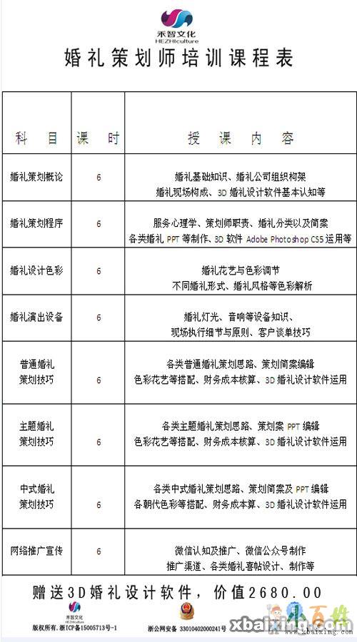 课程内容:婚礼统筹师培训、婚礼策划培训、商业演出策划培训、3D婚礼演出软件的设计与运用,经济发相关知识、财务成本核算、微信平台制作推广、大型搜索引擎客户渠道建立等课程。