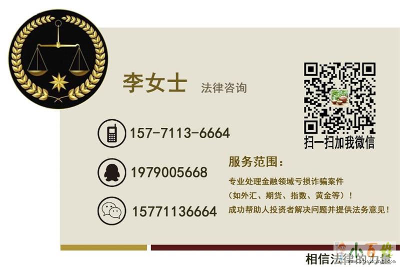 对股票配资、期.货、现货、各种指数、大宗商品、外汇等亏损/不让出金等挽损,言法说法律咨询是专业的,也是认真的x b a i x i n g c o m。网络并非法外之地,我们要懂得拿起合法武器捍卫自己的权益!路遥知马力,日久见人心,市场总会有那些人被赚钱的诱惑所左右,最终资金投入进去,了了而终,含恨而不及。真心希望大家慧眼识珠,投资需谨慎再谨慎。如有朋友不慎被骗,可马上联系言法说法律咨询V/Q:1979005668!更多金融骗局曝光请关注微信公众号:言法说